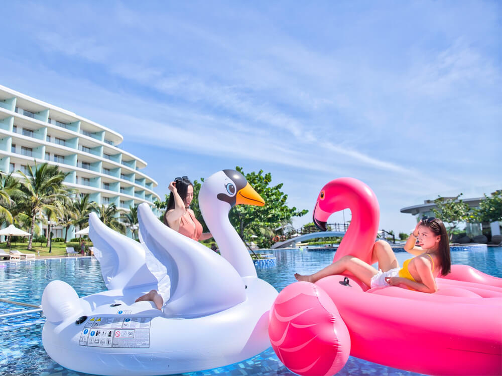 Với hệ thống bể bơi có kiến trúc sang trọng, đẳng cấp, không gian và khung cảnh xanh mát tại đây làm hài lòng tất cả những du khách có đam mê vận động. Bể bơi được chia thành 2 khu vực người lớn và trẻ em để dễ dàng phục vụ mọi đối tượng. “Sải cánh” giữa làn nước mát lạnh mùa hè, ấm áp vào mùa đông, du khách hẳn sẽ cảm thấy sảng khoái tuyệt vời.